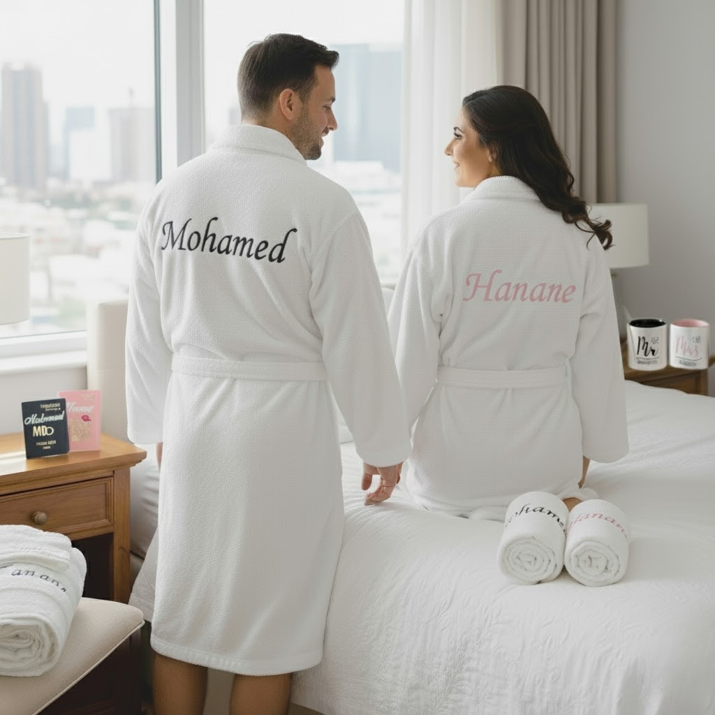À l’intérieur du Coffret Signature Love Duo, retrouvez deux peignoirs brodés Mr & Mrs, doux taille unique, absorbants et parfaits pour créer un véritable spa à la maison. Le coffret inclut également deux serviettes de bain 70 × 140, deux serviettes de toilette 50 × 100 et deux gants de toilette assortis, tous choisis pour leur qualité et leur confort. Pour compléter ce moment de relaxation, vous trouverez deux mugs Mr & Mrs, parfaits pour un café ou un thé en amoureux, ainsi que deux étuis passeport Mr & Mrs rose et noir, idéals pour les voyages et escapades en couple.